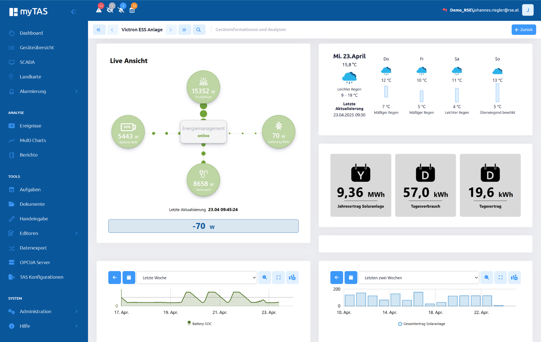 - Laufende Abfrage der Betriebsdaten per SMS-Abfrage, Sprachanruf oder komfortabel mit Statusanzeige über das myTAS-Portal