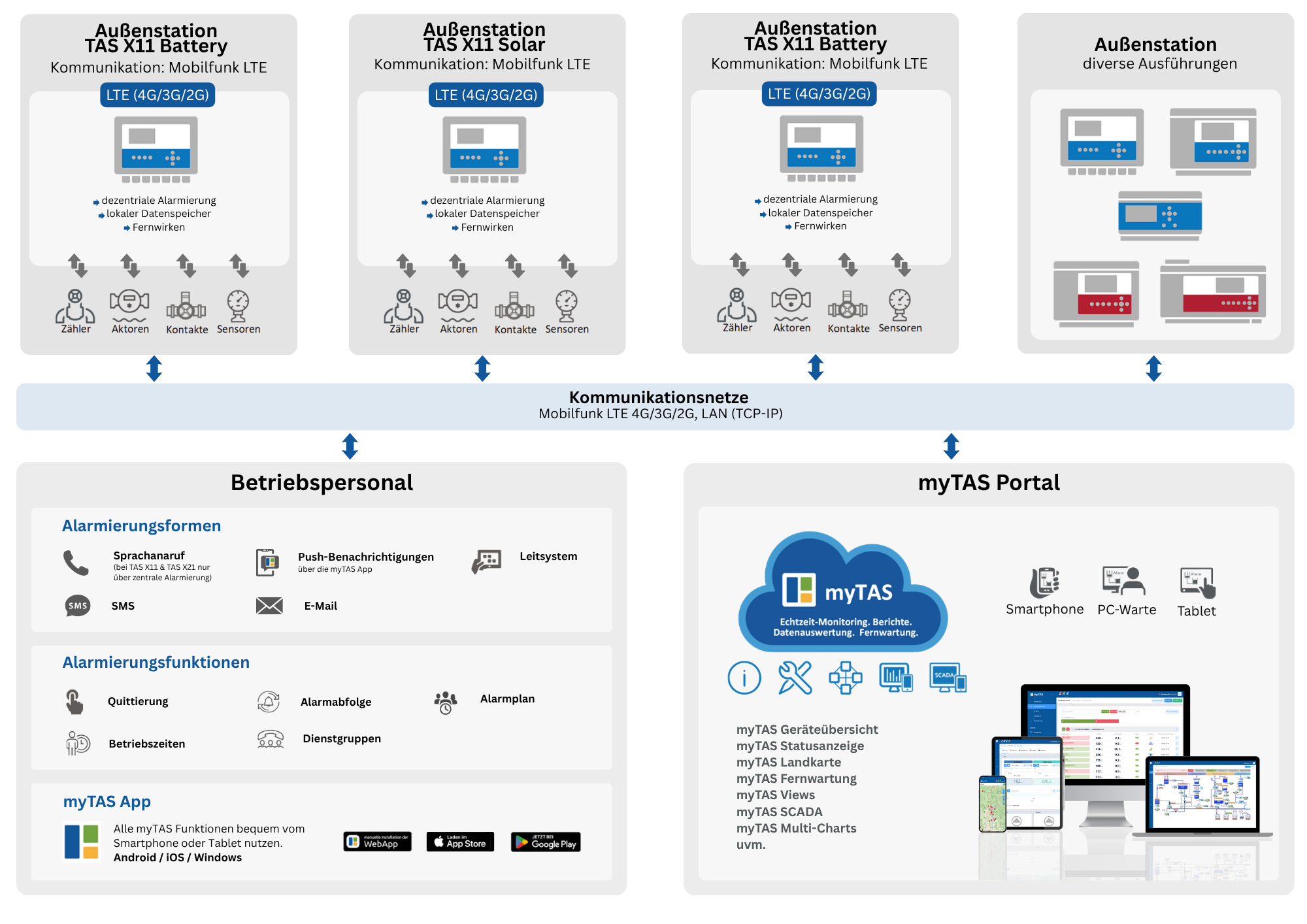 Für die Alarmierung steht bei einer TAS Außenstation das jeweils intergrierte Modem (LTE, GSM, Analog, VoIP) für eine dezentrale Alarmierung zur Verfügung. Die möglichen Alarmierungsformen variieren je nach Modemtype und umfassen Sprachrufe, SMS sowie E-Mail.